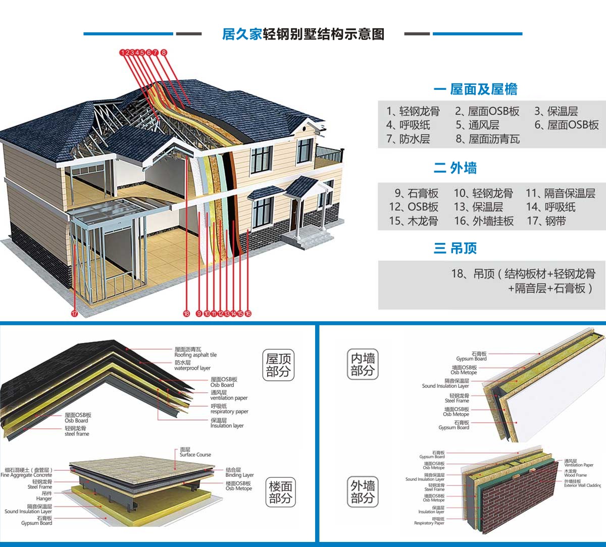 居久家輕鋼別墅隸屬于四川萬建城建筑工程有限公司,集科研、設(shè)計、咨詢、加工、生產(chǎn)安裝為一體。一直致力于新型輕鋼結(jié)構(gòu)房屋的研究、開發(fā)和應(yīng)用,倡導(dǎo)房屋建筑的設(shè)計和應(yīng)用在標準化、模塊化、通用化、規(guī)?;a(chǎn)的同時,實現(xiàn)人居環(huán)境的個性化、人性化、以及健康和舒適。 公司目前引進具有國內(nèi)先進水平輕鋼結(jié)構(gòu)房屋建筑技術(shù)和生產(chǎn)線,標準化、精細化和定制化設(shè)計、制造、安裝輕鋼結(jié)構(gòu)房屋。不僅能夠提供風格各異的別墅建筑,同樣能夠提供行業(yè)標準的輕鋼樓宇建筑及建筑群。居久家裝配式房屋技術(shù)體系是高效節(jié)能型綠色建筑體系,各項建筑物理性能卓越,處于業(yè)內(nèi)先進水平,能夠為客戶提供全程模塊化綠色建筑集成解決方案。